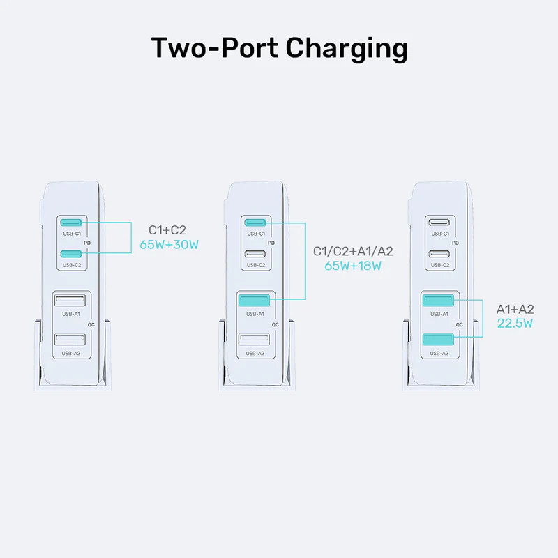 Charge via USB-C1 and USB-C2 for 65W+30W, USB-C1/C2 and USB-A1/A2 for 65W+18W, or USB-A1 and USB-A2 for 22.5W total. This GaN-powered charger ensures fast and reliable charging for multiple devices simultaneously, making it ideal for powering your laptop, phone, or accessories with ease.