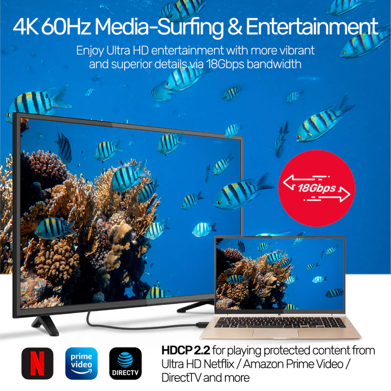 Experience vibrant 4K@60Hz visuals and rich detail with 18Gbps bandwidth. This cable supports HDCP 2.2 for seamless streaming of Ultra HD content from Netflix, Prime Video, and more, making it perfect for media, surfing, and entertainment needs.