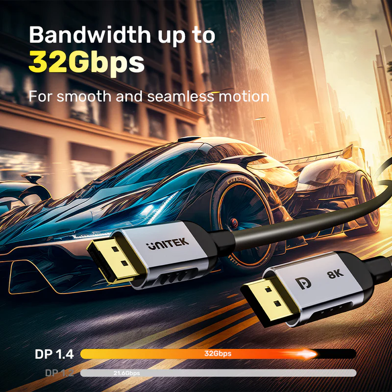 Enjoy smooth and seamless motion with a bandwidth of up to 32.4 Gbps, ensuring comprehensive signals are transferred without latency. The UNITEK 8K DisplayPort cable supports features like 8K resolution, DSC 1.2, Dynamic HDR, FEC, BT.2020 color space, 32 audio channels, and a 1536 kHz sample rate, along with HDCP 2.3. Elevate your gaming experience with this advanced technology, providing the clarity and responsiveness you need for an immersive adventure.