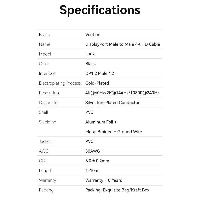 Vention DisplayPort Male to Male 4K HD Cable Black